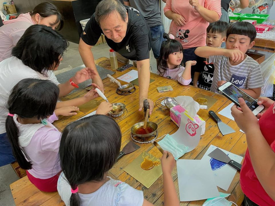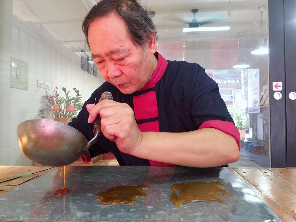 體驗如何在有限時間內,在鐵板上刻劃滾燙的糖漿,待冷卻後獲得屬於自己的一支糖人。操作過程學員先在紙上畫出圖案輪廓,老師傅在講解該如何勾勒,協助學員完成作品,製作時間大約20-30分鐘。